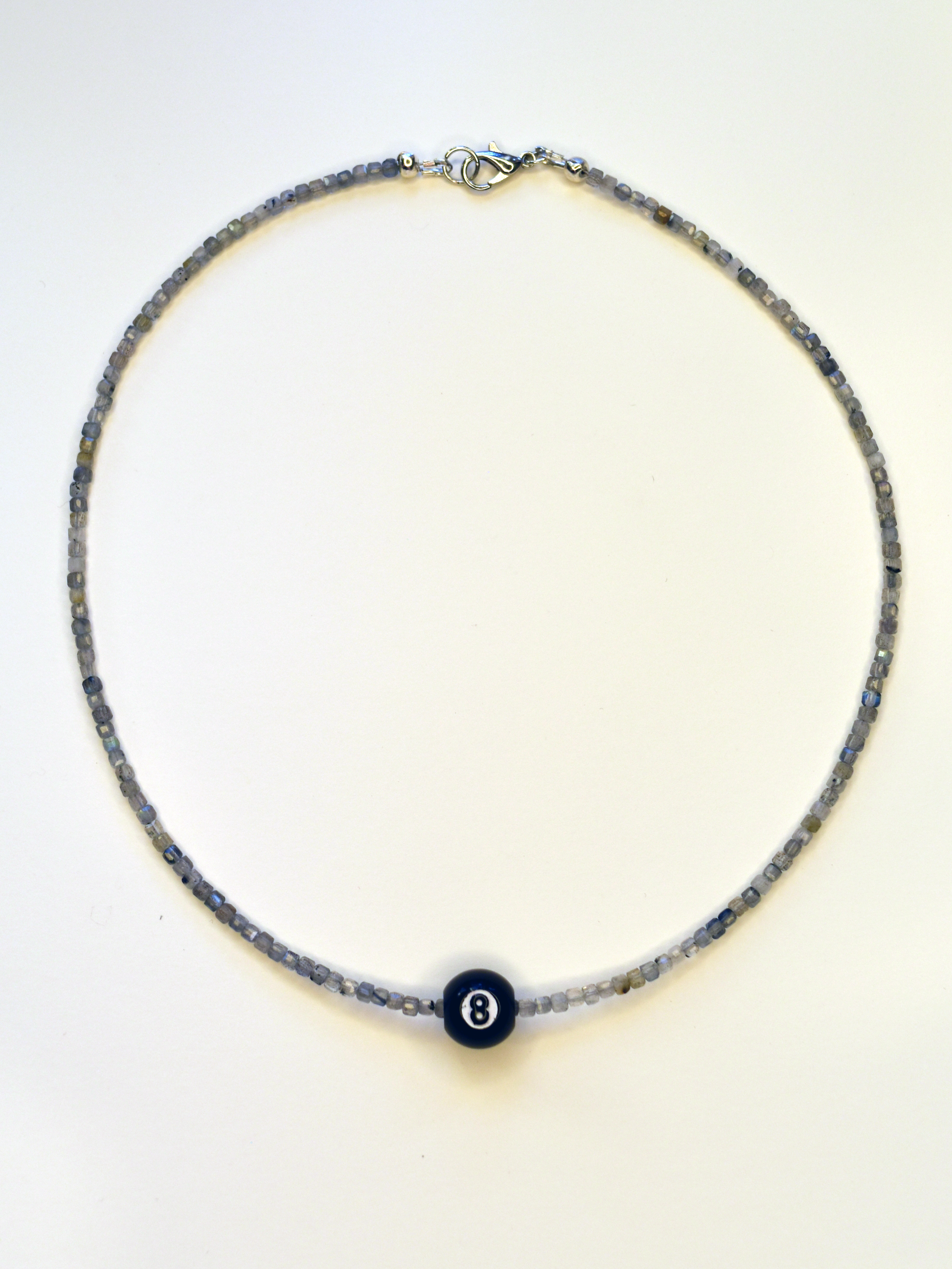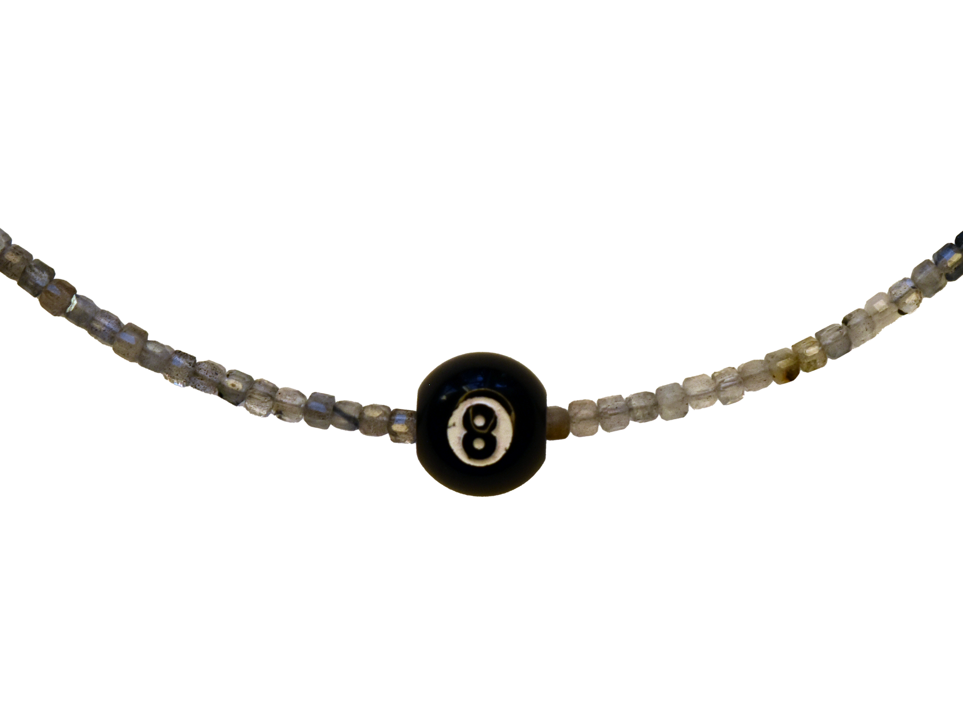 This necklace features dainty glass beads and a pool ball charm that slides freely over the beads.