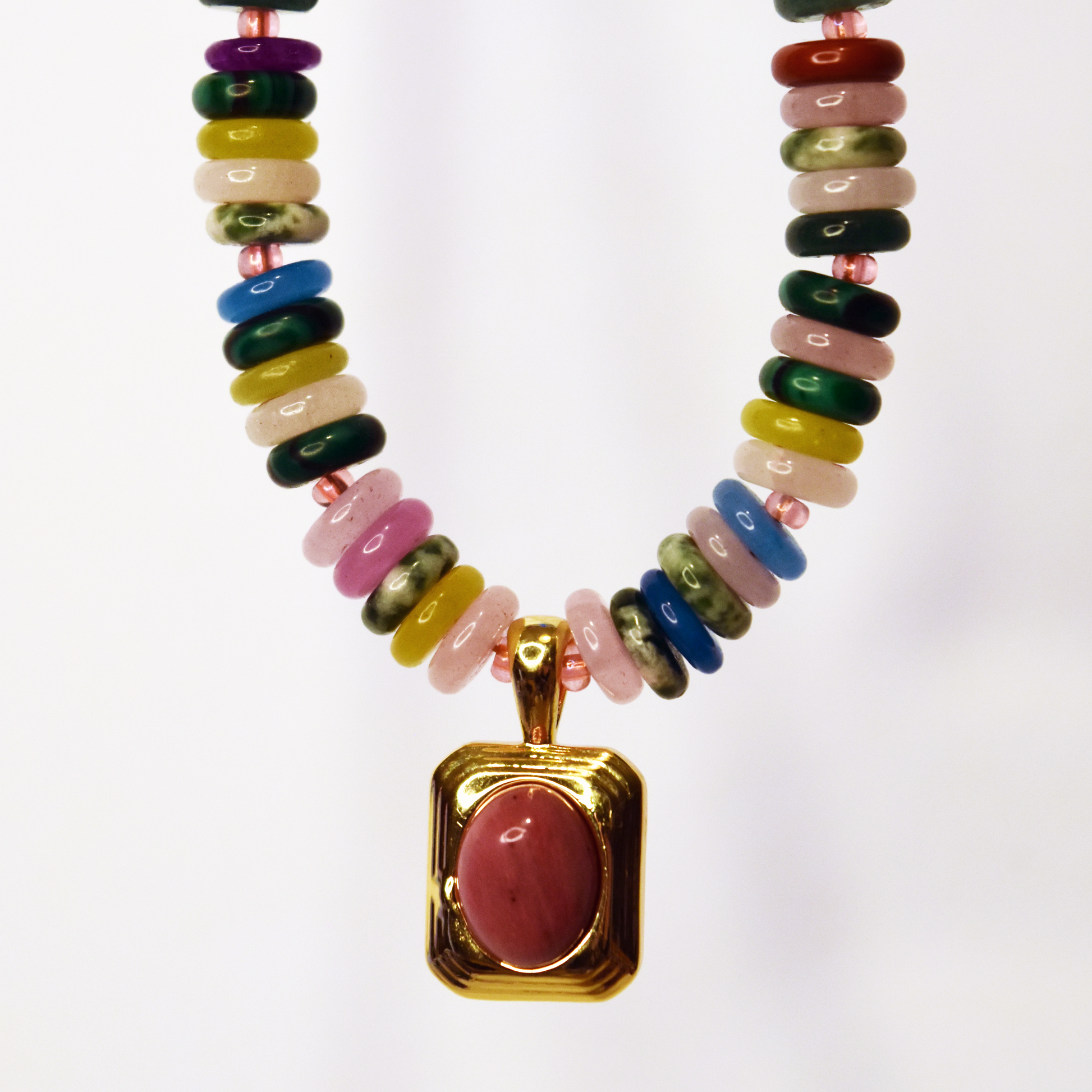 This vibrant beaded necklace bursts with color, anchored by a gorgeous rhodonite rectangle pendant that brings a touch of gemstone magic to your everyday glow.